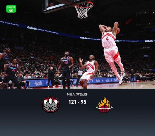 第四節(jié)猛龍珀爾特爾拿下7分,熱火凱沙德-約翰遜拿下7分,最終猛龍121-95戰(zhàn)勝熱火