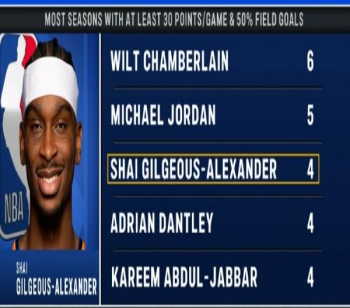 算上本賽季(場均31.3分,命中率55.4%),亞歷山大生涯第四次賽季以50%以上命中率場均砍下30+,歷史僅次于張伯倫的6次和喬丹的5次。