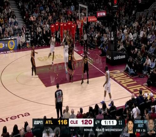 ——剩下1分11秒前,騎士120-116領(lǐng)先4分,還是米切爾,再次造犯規(guī)兩罰全中
