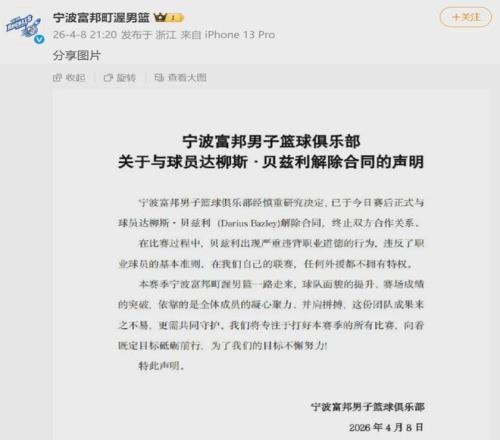 貝茲利本場只打了55秒,就被球隊DNP了。賽后不到1分鐘,寧波男籃宣布解除合同,可謂是雷厲風(fēng)行。寧波男籃寫道:“貝茲利出現(xiàn)嚴(yán)重違背職業(yè)道德的行為,違反職業(yè)球員基本準(zhǔn)則。在我們自己的聯(lián)賽,任何外援都不能擁有特權(quán)?!?/p>