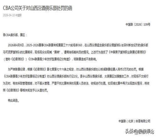 2026年4月9日,2025-2026賽季CBA聯(lián)賽常規(guī)賽第三十六輪場序360,在山西汾酒猛龍俱樂部汾酒籃球隊(duì)與深圳新世紀(jì)烈豹俱樂部馬可波羅籃球隊(duì)的比賽期間,現(xiàn)場觀眾出現(xiàn)喊“黑哨”、謾罵臨場裁判員的情況。上述行為違反了《中國男子籃球職業(yè)聯(lián)賽紀(jì)律準(zhǔn)則》(簡稱《紀(jì)律準(zhǔn)則》)《CBA聯(lián)賽青少年友好型賽場記分制度》,給聯(lián)賽造成不良影響。