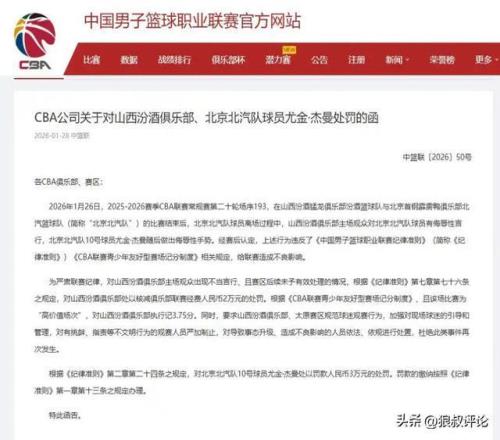 為嚴(yán)肅聯(lián)賽紀(jì)律,根據(jù)《紀(jì)律準(zhǔn)則》第七章第七十六條之規(guī)定,對山西汾酒俱樂部處以核減聯(lián)賽經(jīng)費(fèi)人民幣2萬元的處罰。根據(jù)《CBA聯(lián)賽青少年友好型賽場記分制度》對山西汾酒俱樂部執(zhí)行記2分。