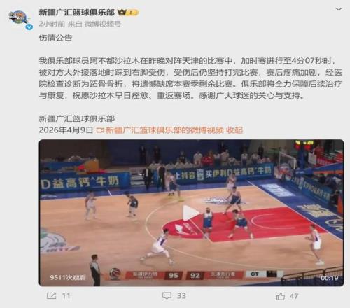 北京時間4月9日晚,CBA新疆男籃官方宣布:阿不都沙拉木在對陣天津的比賽中,被對方大外援落地時踩到右腳受傷,診斷為跖骨骨折,本賽季正式報銷。本賽季CBA常規(guī)賽只有42輪,目前新疆男籃13勝23負,僅排聯(lián)賽第15位。