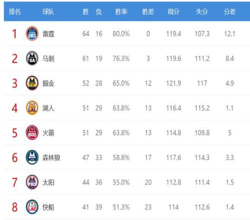 掘金、湖人、火箭爭奪3-5名,開拓者、快船爭8-9名。