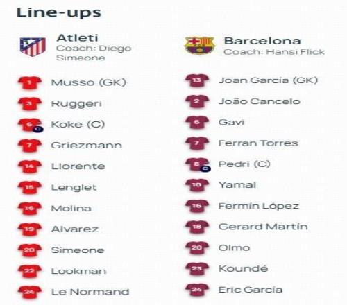 馬競vs巴薩:加維、費蘭、亞馬爾首發(fā),格列茲曼出戰(zhàn)