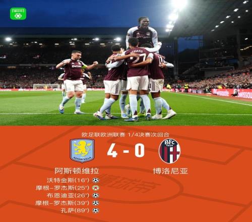 北京時(shí)間4月17日歐足聯(lián)歐洲聯(lián)賽 1/4決賽次回合,阿斯頓維拉對(duì)陣博洛尼亞。上半場(chǎng)沃特金斯首開(kāi)記錄,羅杰斯失點(diǎn),布恩迪亞破門(mén)再下一城,羅杰斯將功補(bǔ)過(guò)破門(mén)擴(kuò)大比分。下半場(chǎng)孔薩破門(mén)鎖定勝局。最終比分阿斯頓維拉 4-0 博洛尼亞。兩回合總比分阿斯頓維拉7-1博洛尼亞晉級(jí)。