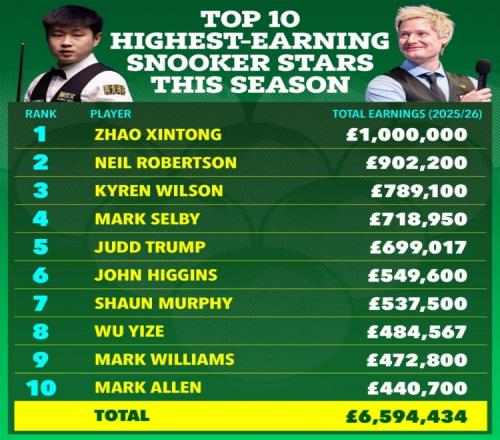 202526賽季斯諾克獎(jiǎng)金收入排行榜:趙心童100萬(wàn)英鎊位列第一