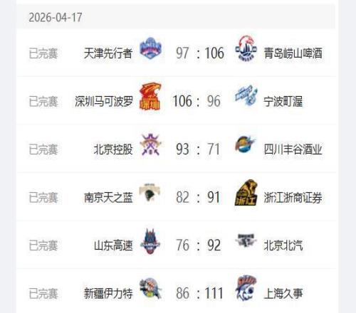 CBA常規(guī)賽接近尾聲,4月17日一共安排了6場比賽,其中北控男籃主場93-71戰(zhàn)勝四川隊,浙江廣廈隊客場91-82戰(zhàn)勝南京同曦隊,深圳隊主場106-96戰(zhàn)勝寧波隊,北京首鋼隊客場92-76戰(zhàn)勝山東高速男籃,青島隊客場106-97戰(zhàn)勝天津隊,上海隊客場111-86戰(zhàn)勝新疆隊。