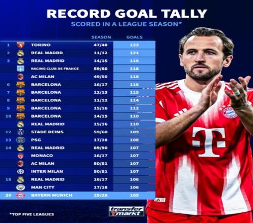 五大聯(lián)賽單賽季進(jìn)球紀(jì)錄,拜仁這季有望打破