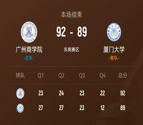 第四節(jié),廈門大學(xué)突然啞火,廣州商學(xué)院大舉反擊,內(nèi)外開花轟出17-0的攻擊波強(qiáng)勢反超,鄭博文艱難破荒,廈門大學(xué)苦苦追趕,廣州商學(xué)院穩(wěn)扎穩(wěn)打保持優(yōu)勢,最終,廣州商學(xué)院92-89力克廈門大學(xué)。