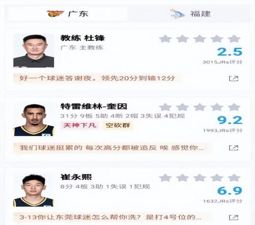 這場比賽結(jié)束后,超過1.4萬的球迷對球員進(jìn)行了評分,杜鋒和杜潤旺的評分最低,只有2.5分和2.6分。杜鋒的問題就不多說了,這段時(shí)間球迷們已經(jīng)討論得夠多了,他在戰(zhàn)術(shù)和用人方面非常固執(zhí)。杜潤旺作為一名投手,這場比賽打了16分鐘沒有得分進(jìn)賬,而且防守的問題非常明顯,在場上幾乎可以說是負(fù)作用了,評分比較低也很正常。另外小將陳家政這場比賽的表現(xiàn)也不好,防守端的問題很大,接下來需要好好總結(jié)。