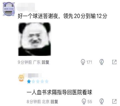 杜鋒對于皮特森這一點的防守,確實是相當(dāng)失敗的,球迷也熱議道:“好一個球迷答謝夜,領(lǐng)先20分到輸12分”、“一人血書,求隔指導(dǎo)回醫(yī)院看球”。