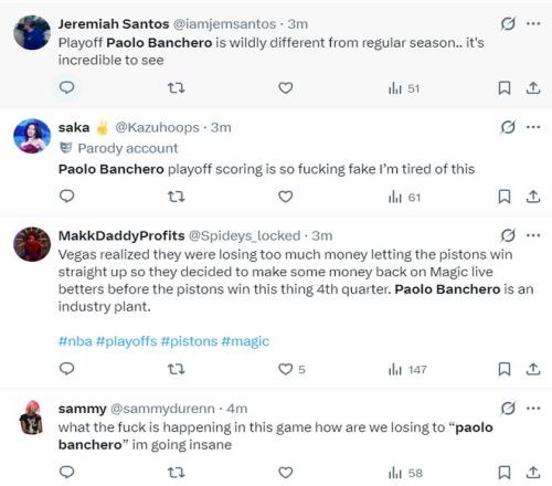 已經(jīng)有球迷表示,班凱羅季后賽的表現(xiàn)跟他常規(guī)賽判若兩人。更有活塞的球迷認為班凱羅季后賽的表現(xiàn)太假了,如果魔術爆冷贏球聯(lián)盟應該審查班凱羅。(前三節(jié)小瓦格納只拿到8分都沒人討論他)