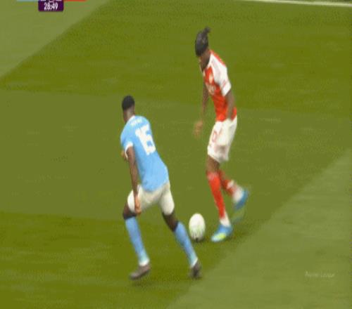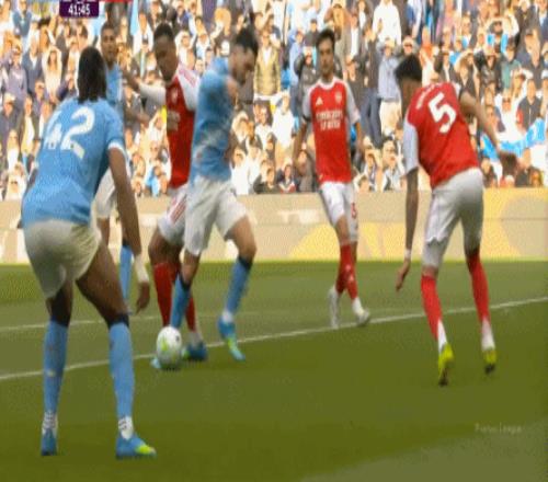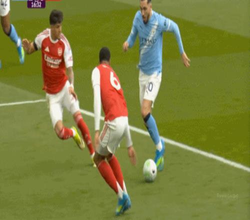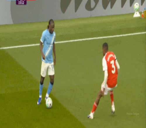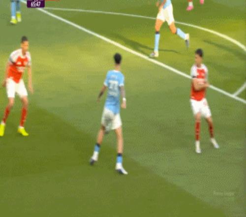 這一球的根源,其實(shí)就是阿森納的逼搶確實(shí)是讓曼城球員有所忌憚,所以在這次后場(chǎng)界外球,努內(nèi)斯沒有按照常規(guī)思路拋給擁有身體優(yōu)勢(shì)的哈蘭德,選擇另辟蹊徑交給多納魯馬,結(jié)果后者在哈弗茨的逼搶下,先停再傳,就被哈弗茨趕上了: