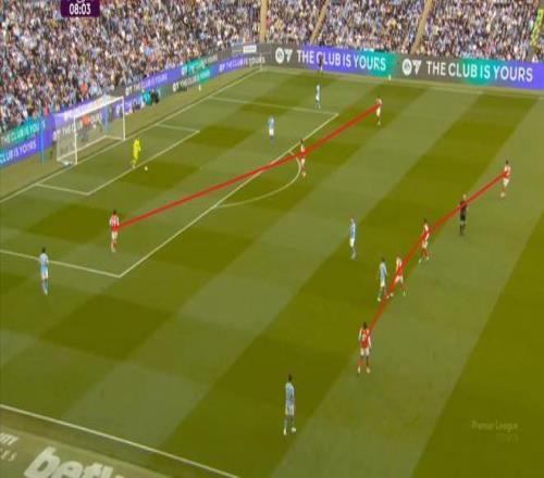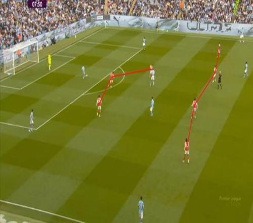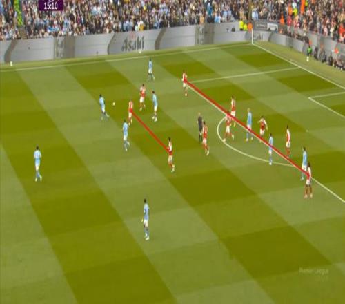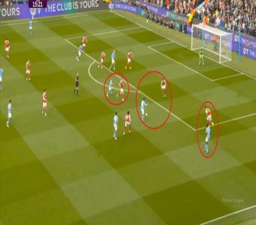 這是一個(gè)相當(dāng)激進(jìn)的逼搶思路,如果選用的球員在跑動(dòng)、變向上稍有不足,從而給曼城露出哪怕是幾度的角度或者幾秒的時(shí)間,曼城就有可能層層剝繭,一步步打到阿森納的兩線之間,威脅到最后三人防守的防線。